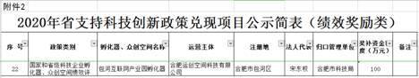 2020年(ni ↕án)12月(yuè)3日(rì),2020年(nián)安徽省 支持科(kē)技(jì)創新有(yǒu)關政策(第三批)拟兌現σ σ (xiàn)項目公示。由合肥運創空(kōng)間(ji♥& εān)科(kē)技(jì)有(yǒu)限公司運營的(de)包河(hé)互♠≥聯網産業(yè)園孵化(huà)器(qì),榮獲國(guó)家(jiā®↔≠λ)和(hé)省級科(kē)技(jì)企業(yè)孵化(huà€≥)器(qì)、衆創空(kōng)間(ji≥★ān)績效獎勵,并獲獎補資金(jīn)100萬元。